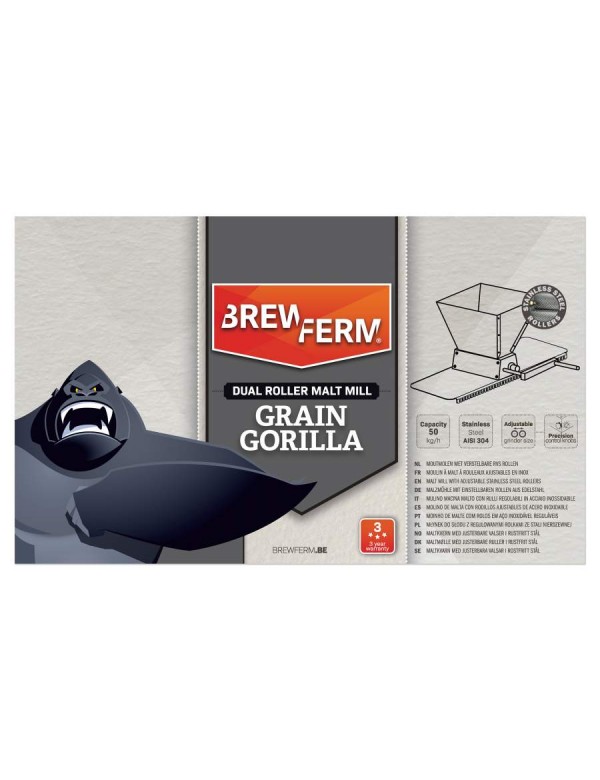Grain Gorilla ; le King Kong des moulins à malt. Les rouleaux réglables en acier inoxydable garantissent que votre malt est aussi finement concassé que vous le souhaitez. Grâce aux boutons pratiques sur le côté, vous pouvez régler facilement et instantanément l'écartement des rouleaux et ainsi l’épaisseur du malt concassé. Au dos du moulin à malt, les 2 ridoirs noirs garantissent que les réglages du moulin à malt restent les mêmes pendant le concassage.