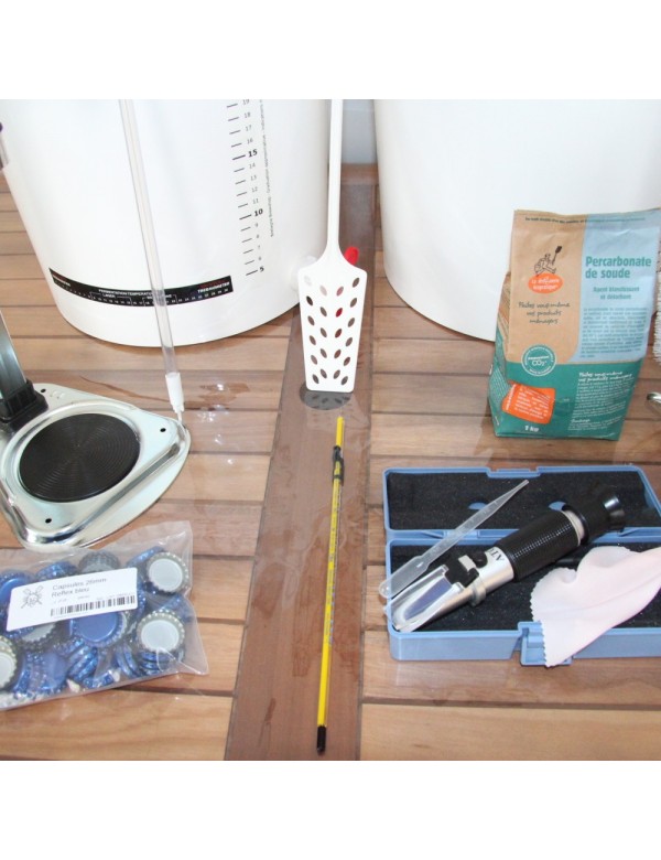 Contient deux seaux de 30L équipés (graduation, robinet, barboteur), dont un avec bande thermomètre, ainsi qu'un réfractomètre, et un thermomètre.